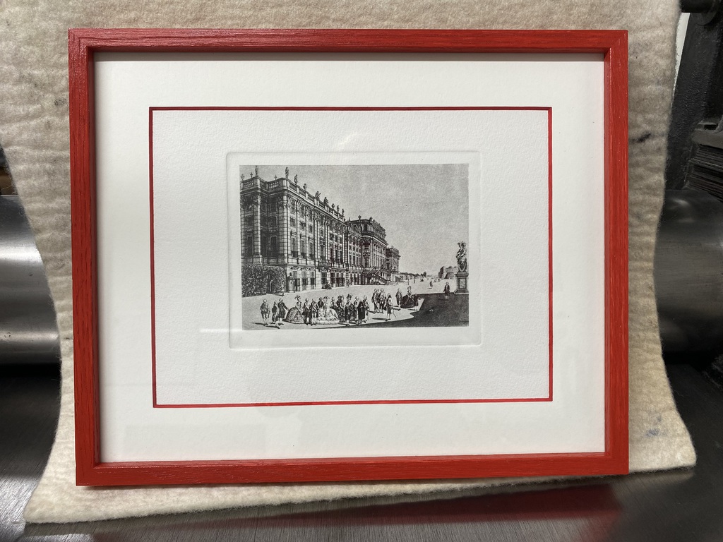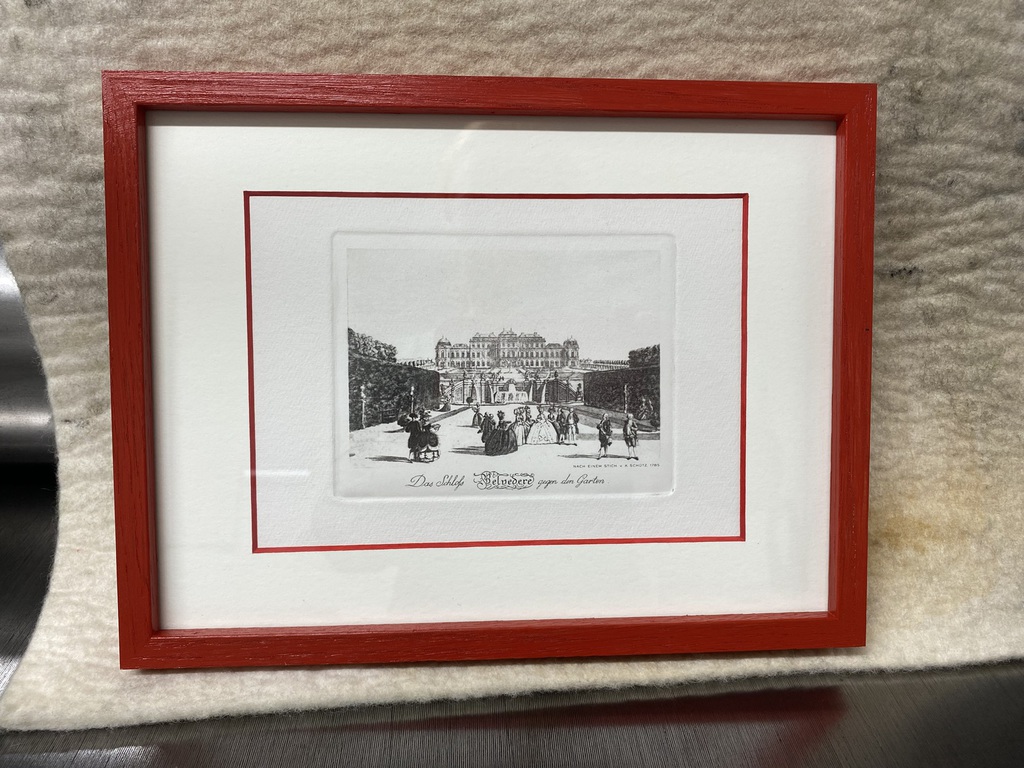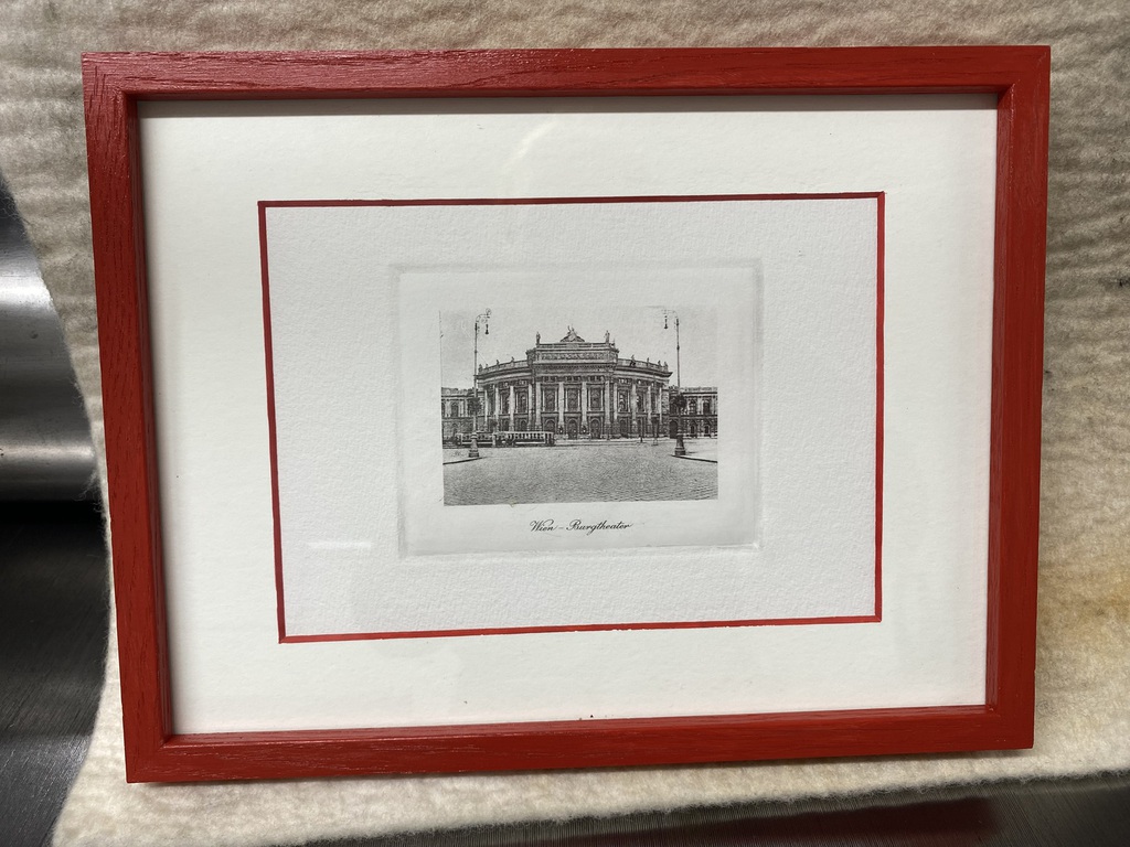 Wien Edition mit herrlichen alten Stadtansichten von Wien als handgedruckter Kupferdruck mit handgefertigten Holzrahmen mit "Wiener Stoss": Passepartout mit rotem Stoss- passend in den österreichisch/Wiener Farben. In verschiedenen Größen von 13x18 cm bis 24x27 cm. Nur wenige lagernd. Ein ungewöhnliches Geschenk aus der l(i)ebenswertesten Stadt der Welt....